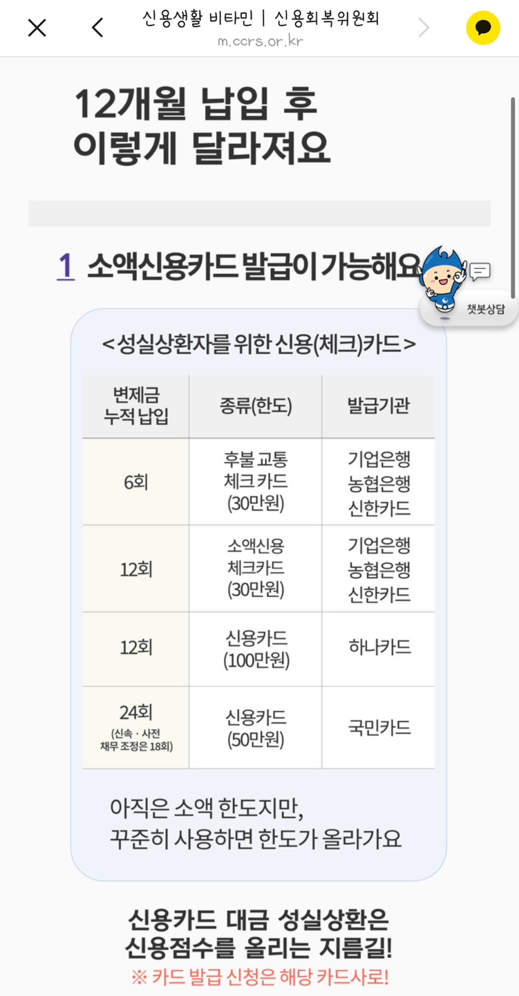 이때 카드사에서는 연속적인 미납금 발생하였을때 신용회복 지원제도 안내를 함께 제공해 줍니다.